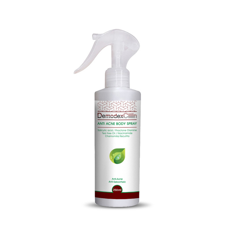 اسپری ضد جوش بدن دمودکسیلین ترکیبات بی نظیری مانند روغن درخت چای و سالیسیک اسید دارد که به این اسپری خواص آنتی باکتریال داده و انواع مشکلات پوستی با منشأ قارچی نظیر التهاب، خارش، قرمزی و درماتیت سبوره را بهبود می بخشد. این محصول رشد قارچ و باکتری های پوستی را متوقف کرده و از تکثیر آن ها و ایجاد جوش های سرسیاه و چرکی جلوگیری خواهد کرد.