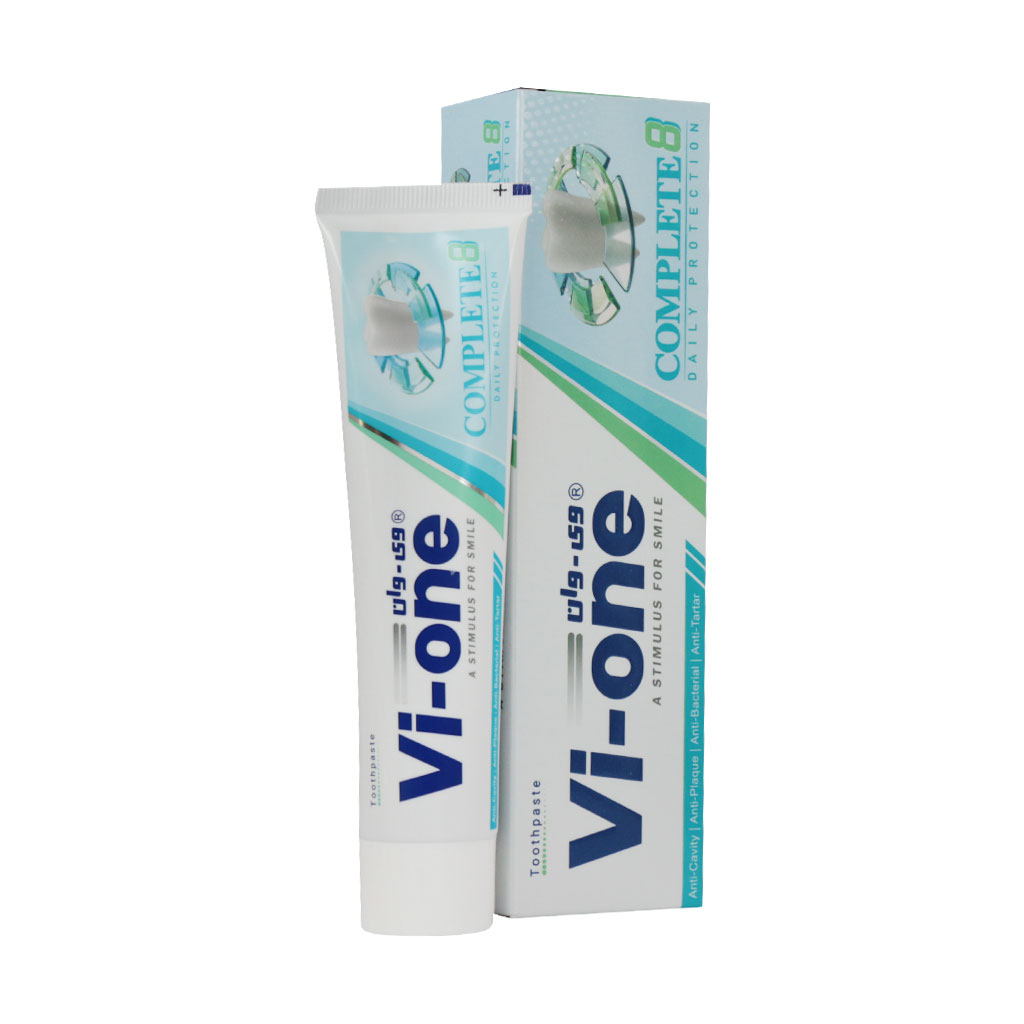 خمیر دندان وی وان مدل Complete ۸ همانطور که از نام محصول نیز مشخص است. ۸ ویژگی برای دهان و دندان را در خود جای داده است.